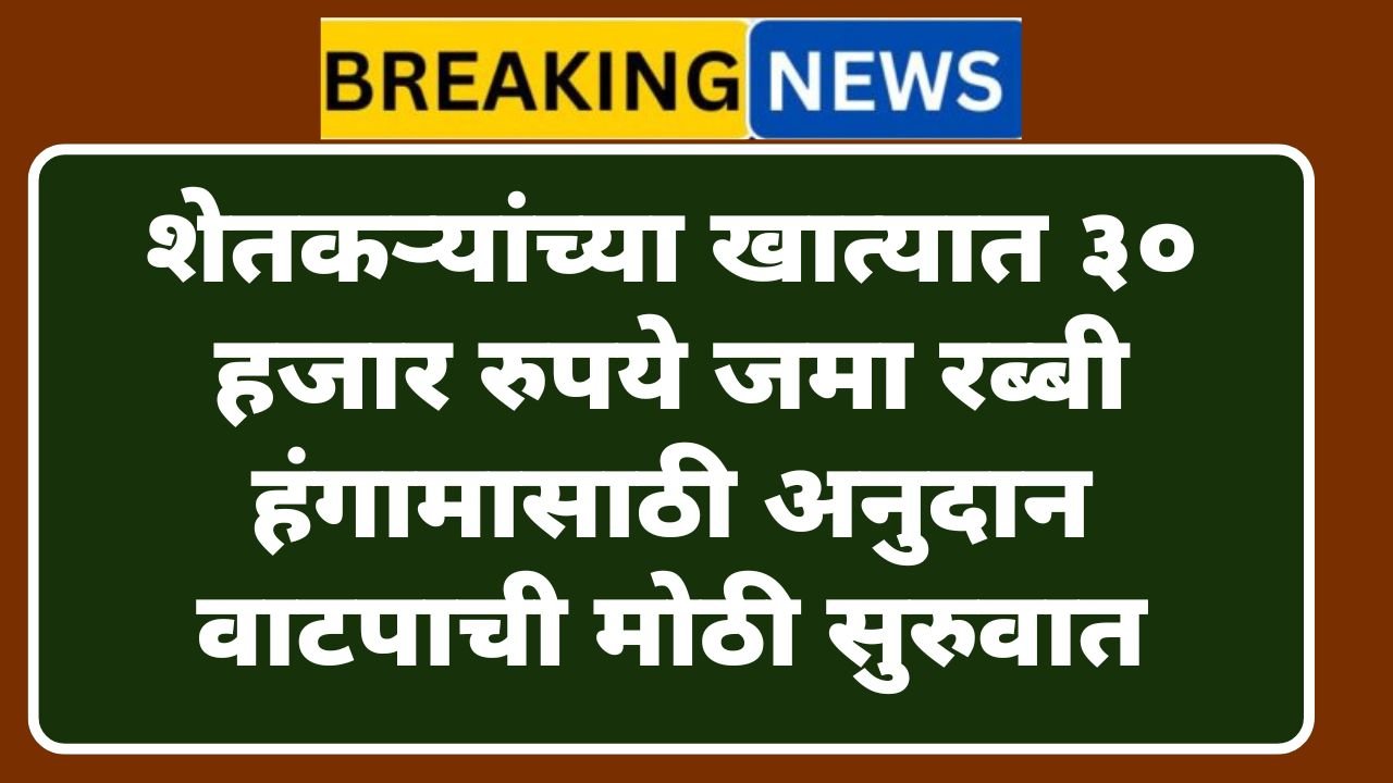 राज्यभरातील शेतकऱ्यांसाठी मोठी दिलासादायक बातमी आली आहे. महाराष्ट्र शासनाने रब्बी हंगामाकरिता देण्यात येणाऱ्या अनुदानाची रक्कम थेट शेतकऱ्यांच्या बँक खात्यात जमा करण्यास सुरुवात केली आहे. आज दुपारी तीन वाजल्यापासून अनेक जिल्ह्यांमध्ये शेतकऱ्यांच्या खात्यात ३० हजार रुपयांपर्यंतचे अनुदान जमा होऊ लागले आहे. या योजनेत प्रति हेक्टर १० हजार रुपये आणि जास्तीत जास्त ३ हेक्टरपर्यंत म्हणजे एकूण ३० हजार रुपये शेतकऱ्यांच्या खात्यात जमा होणार आहेत. पुढील लेखामध्ये आपण पाहणार आहोत — कोणत्या जिल्ह्यांमध्ये अनुदान वाटप सुरू झाले आहे, किती निधी राज्याला मंजूर झाला आहे, आणि शेतकऱ्यांना याचा फायदा कसा होणार आहे.